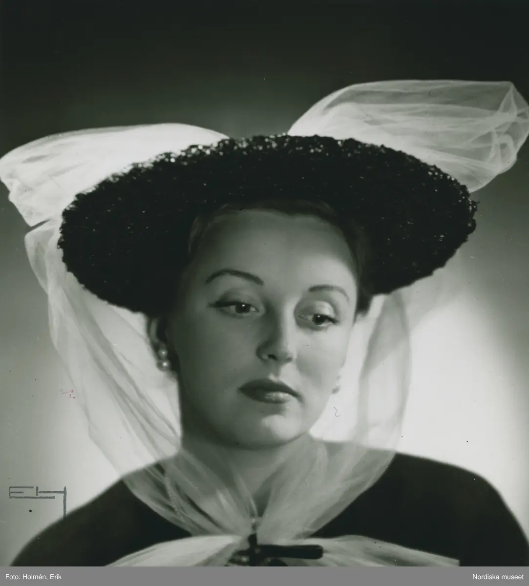 Porträtt av kvinna i svart grov stråhatt med gulbeige tyll. Modell från Nordiska Kompaniet.