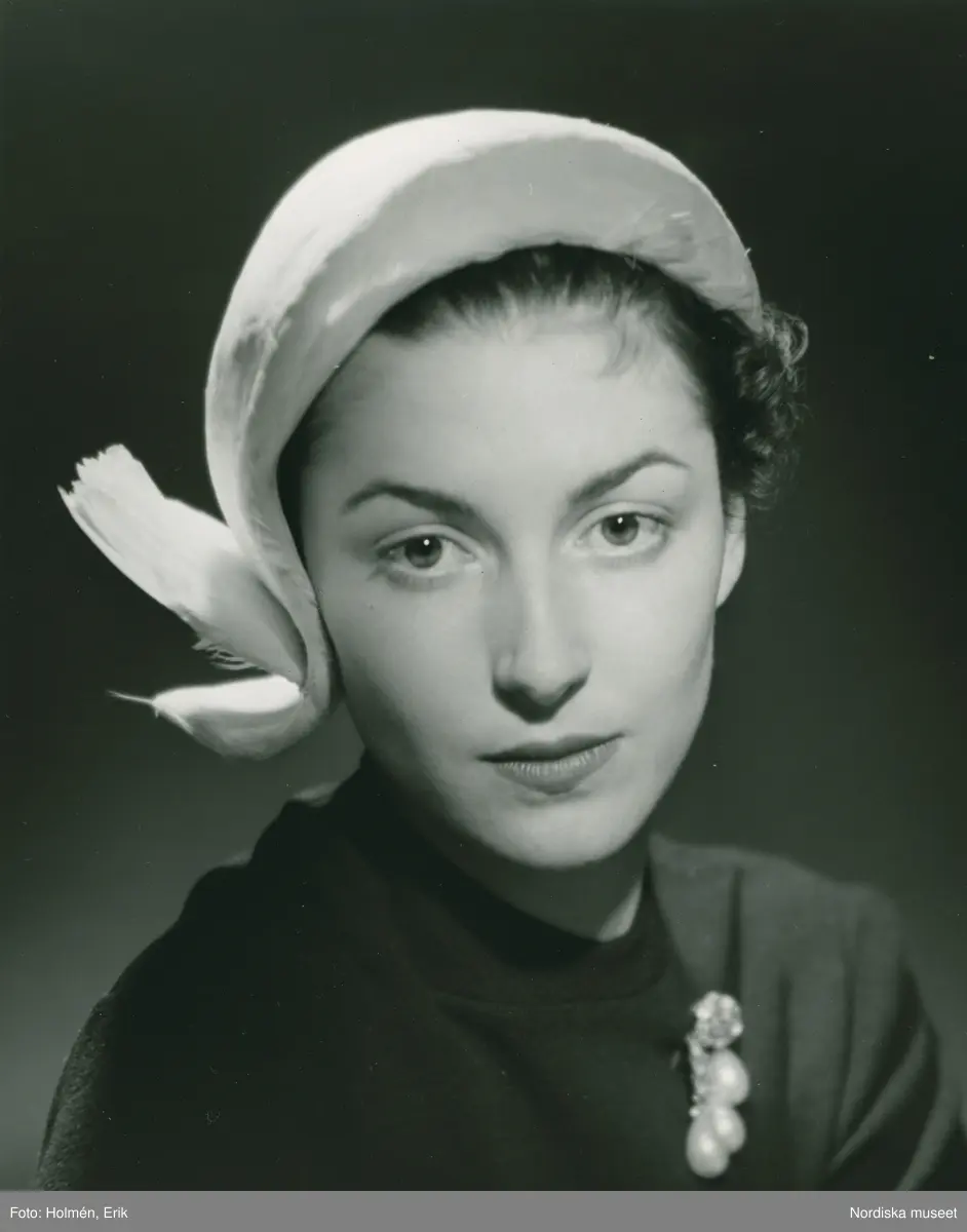 Porträtt av kvinna med vit fjäderhatt. Modell från Nordiska Kompaniet.