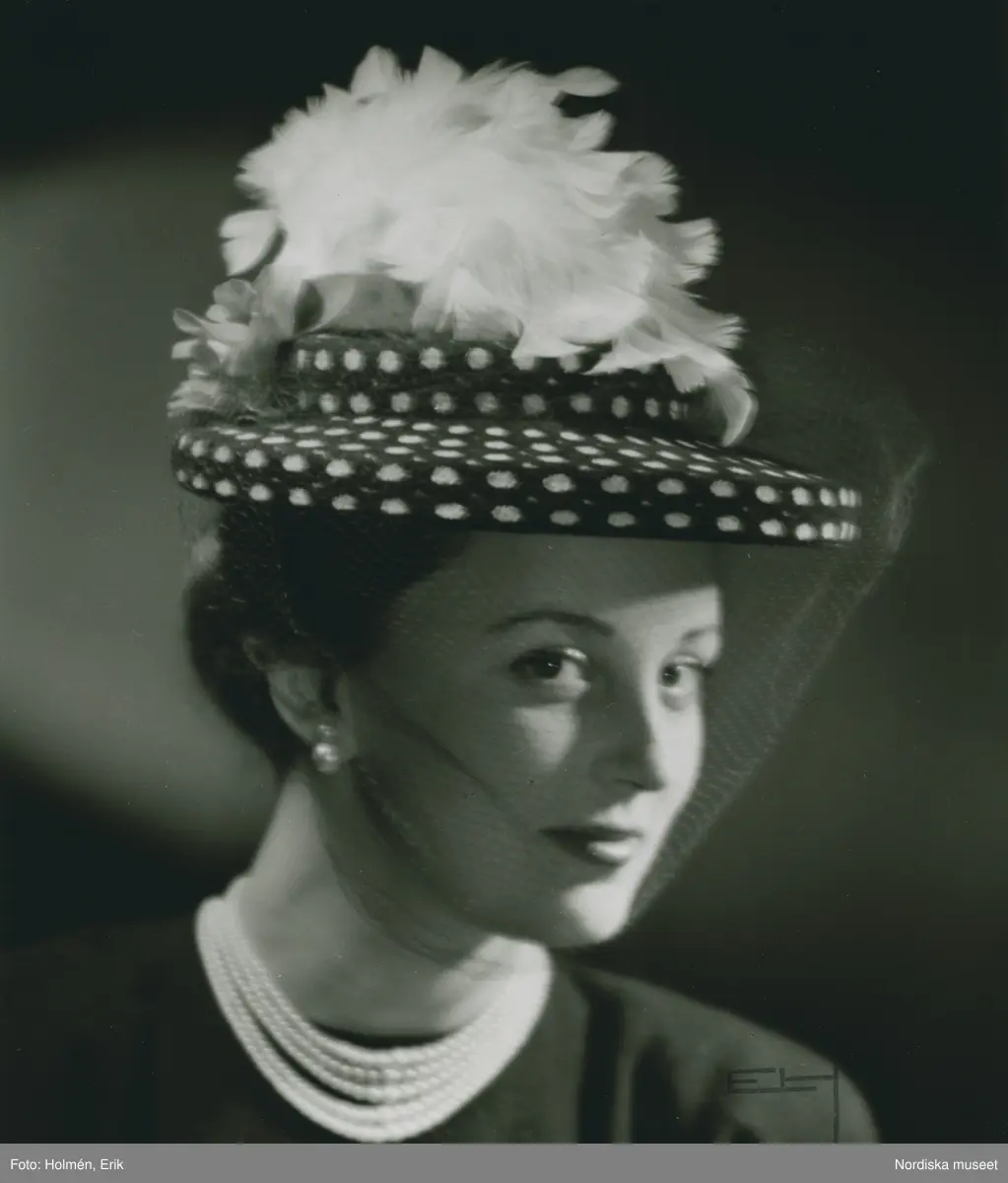 Porträtt av kvinna i marinblå jerseyhatt med vita prickar, flor och vita dekorationer. Modell från Nordiska Kompaniet.