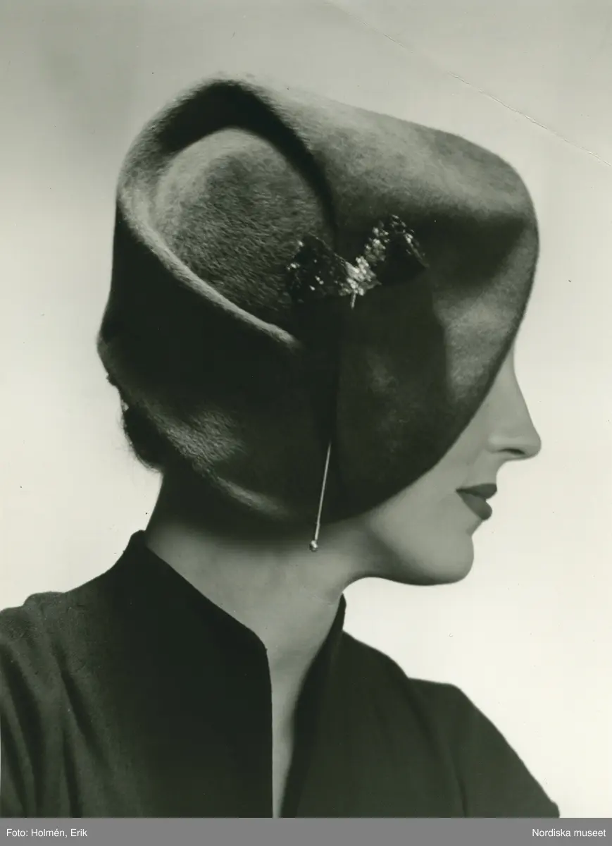 Porträtt av kvinna i grön velourhatt monterad med pil i guld. Modell av Gilbert Orcel.