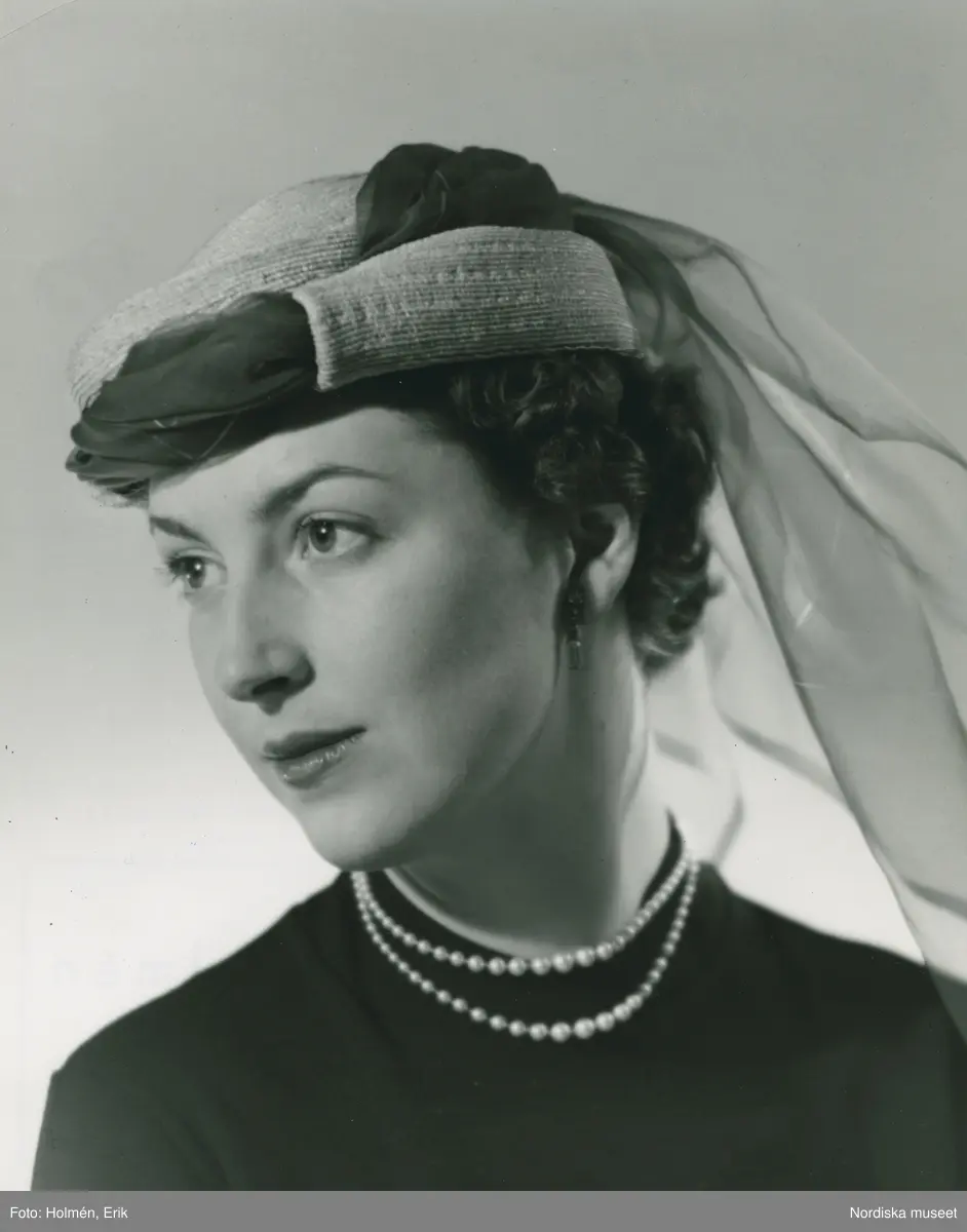 Porträtt av kvinna i guldfärgad stråhatt med tyll. Modell av Marie Christiane.