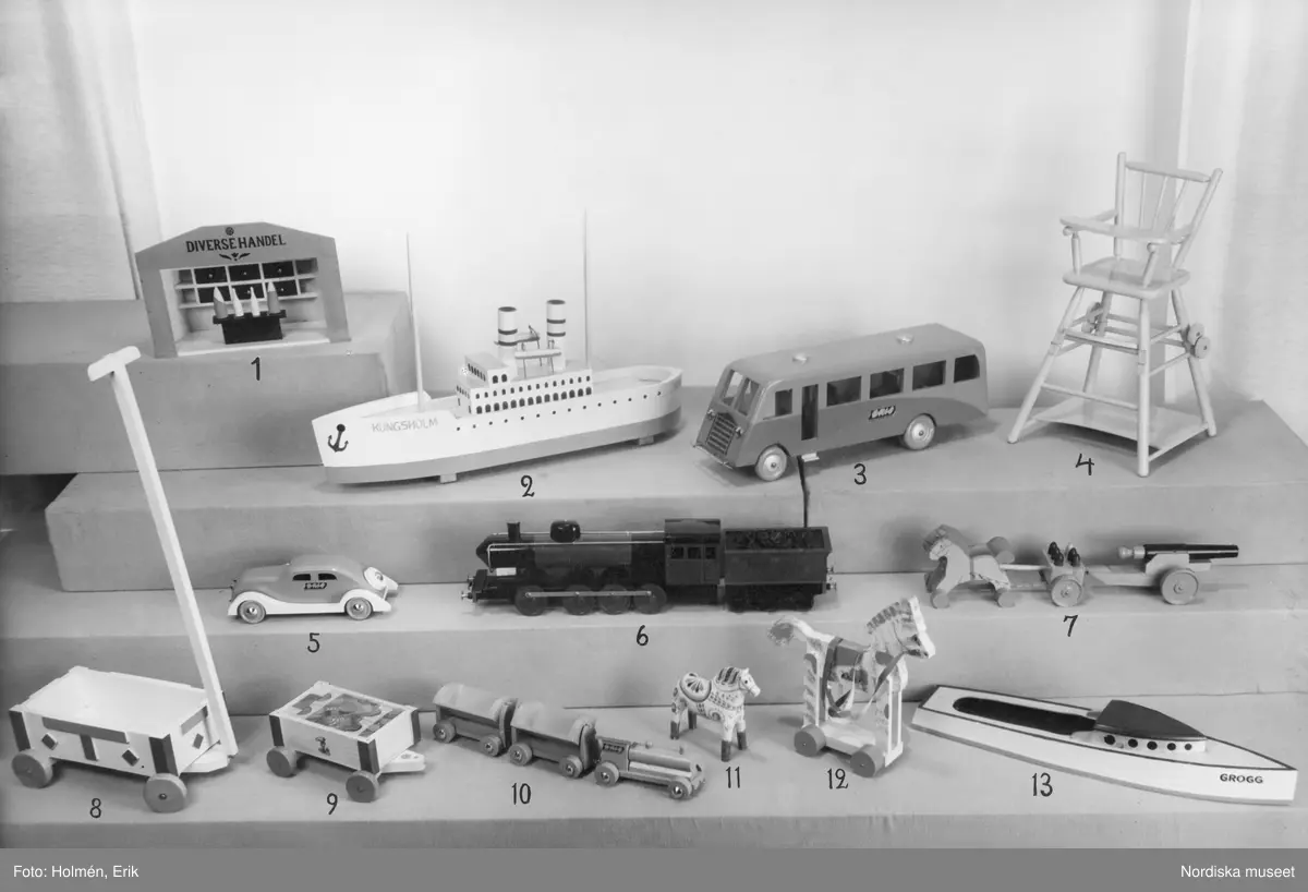 På hyllplan står olika leksaker uppradade tillsammans. Båtar, bil, buss, tåg, en diversehandel och annat.