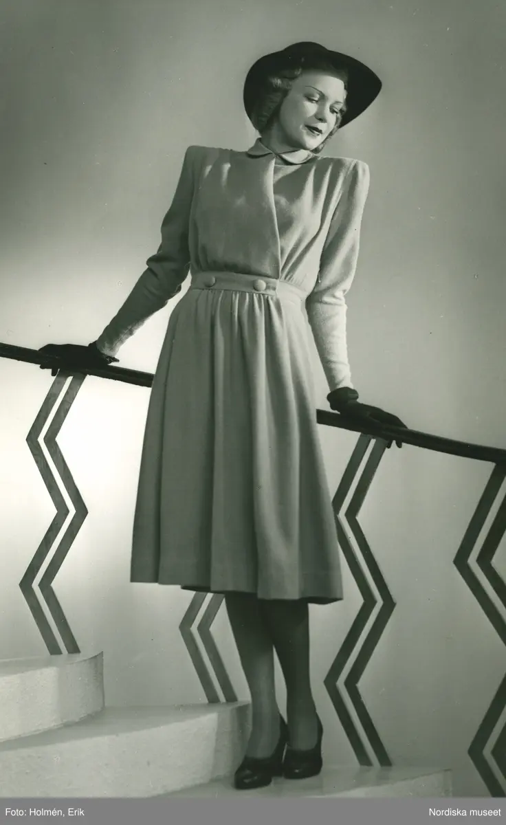 Helporträtt av en kvinna i klänning, hatt och handskar.