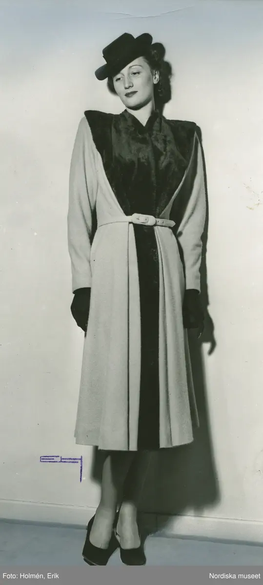 Helporträtt av kvinna i beige kappa i yllecrepe, krage i nutriaskinn.
