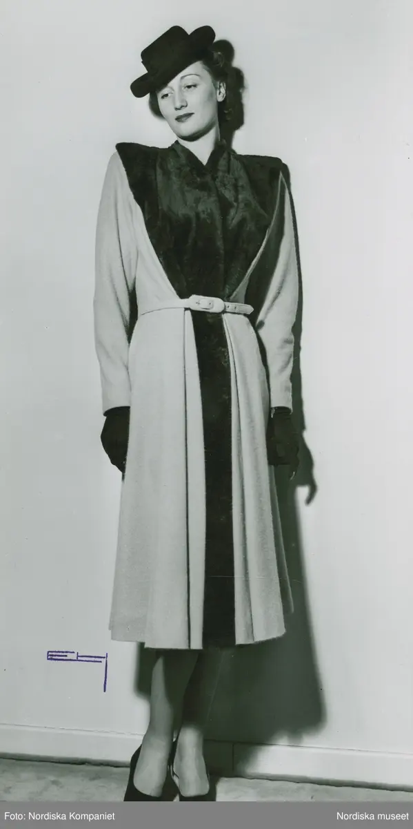 Modell i kappa med pälsdetalj och skärp, hatt, handskar och pumps.