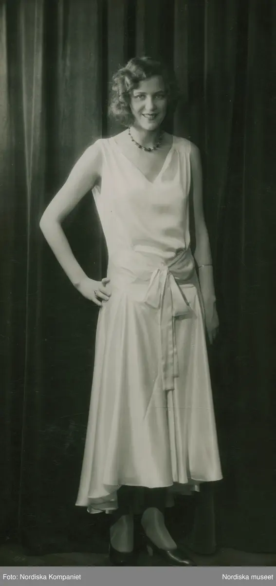 Modell i vit sidenklänning med knutet band vid midjan, halsband och pumps.