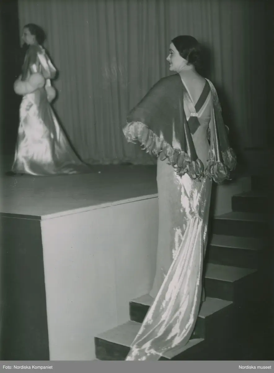 "Wienermodeschau"på Nordiska Kompaniet. Modell i aftonklänning med släp och sammetssjal går uppför en trappa.