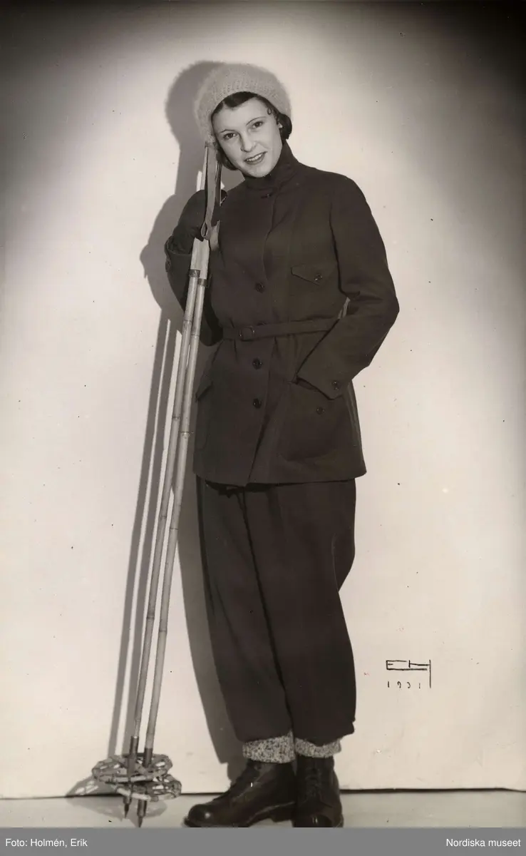 "Sportkläder", Nordiska Kompaniet. Kvinna i skidkläder med stavar i handen.