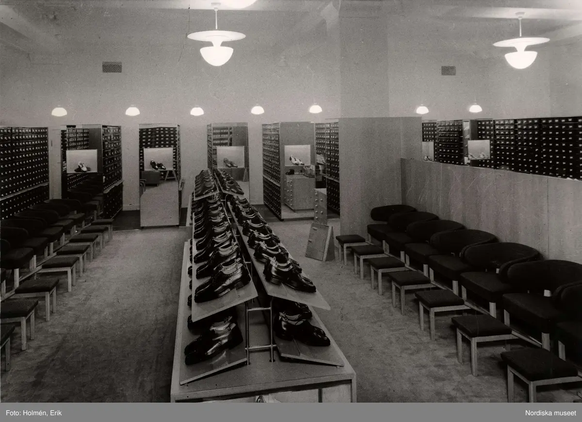 Interiör från avdelningen för herrskor, Nordiska Kompaniet, Stockholm.