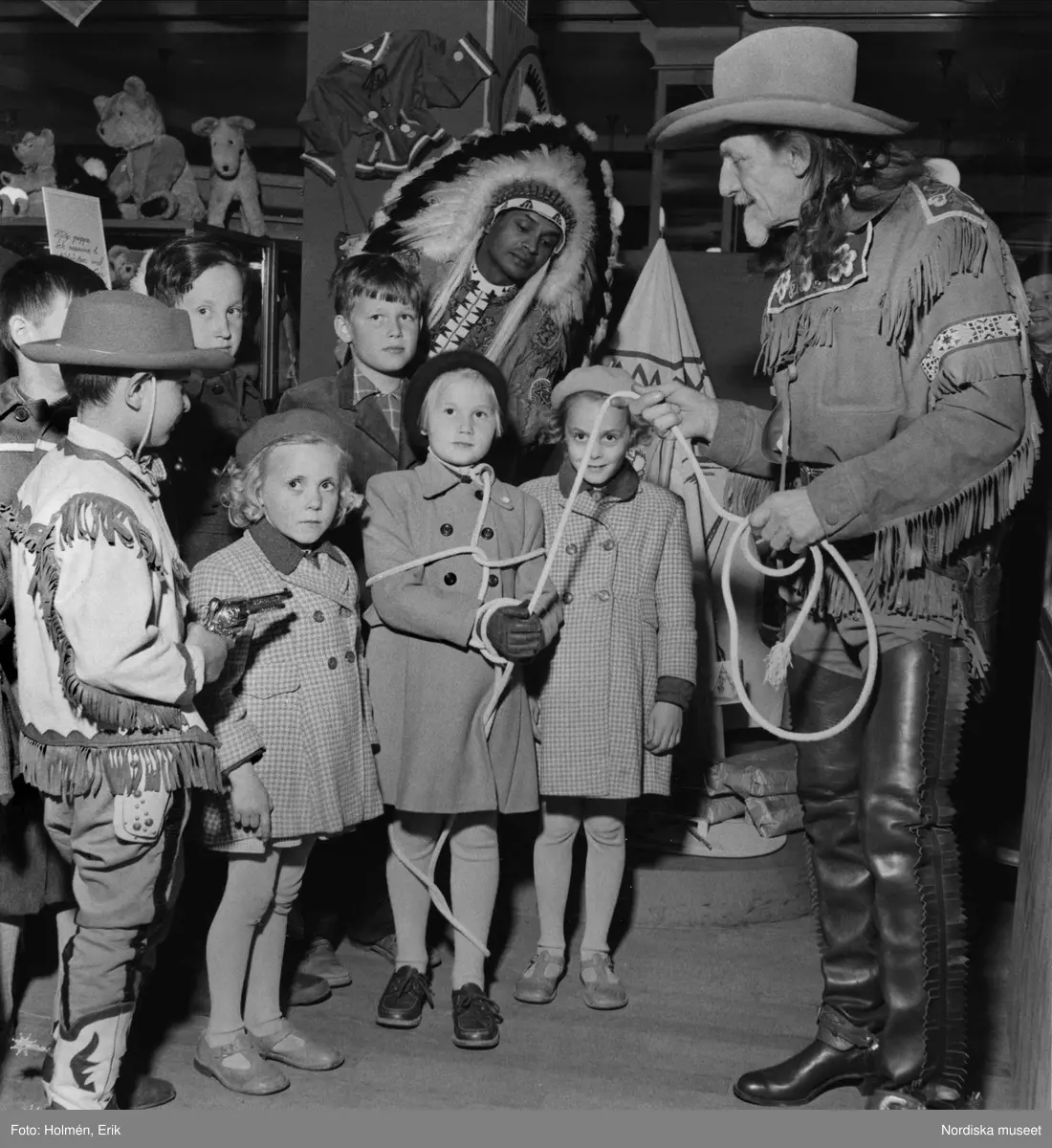 "Buffalo Bill på leksaksavdelningenl". Cowboy och indian tillsammans med barn på Nordiska Kompaniets leksaksavdelning 1953.