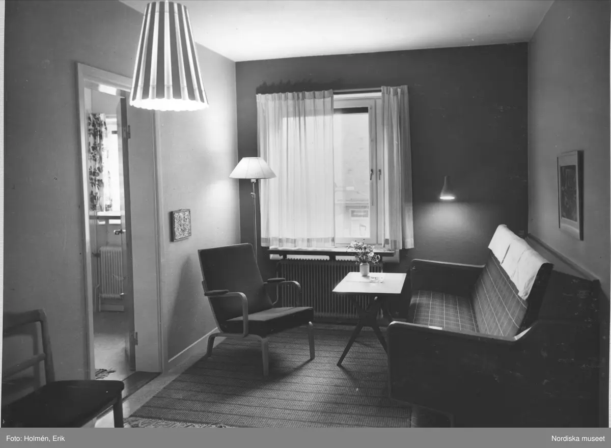 Interiör från ett rum på Hotell Malmen i Stockholm. Inredningen med soffa, bord, fåtölj, lampa och textilier kommer från varuhuset Nordiska Kompaniet.