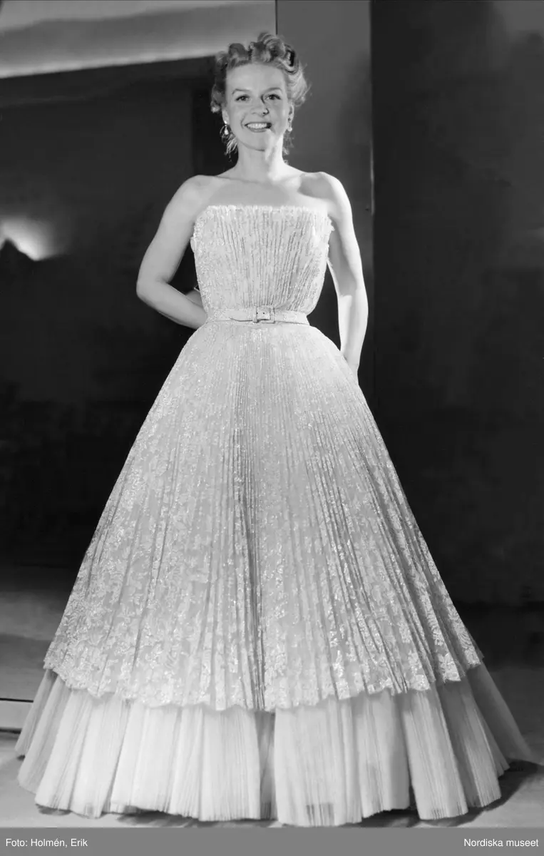 En lång axelbandslös aftonklänning. Nordiska Kompaniet.