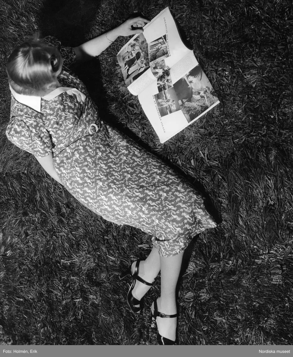 Modell ligger på en matta i en mönstrad klänning. Nordiska Kompaniet.