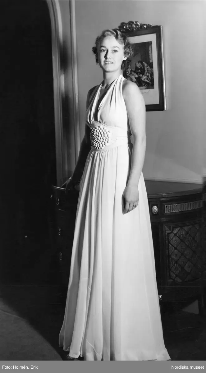 Modell poserar i en ljus aftonklänning. Nordiska Kompaniet.
