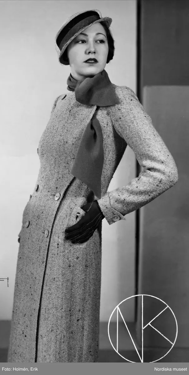 Modell poserar i en dubbelknäppt kappa. Nordiska Kompaniet.