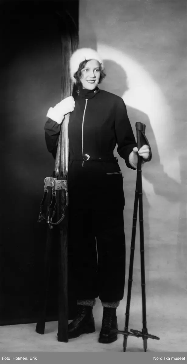 Modell klädd i marinblå skidklädsel i impregnerad gabardin, vit mössa, vita vantar med mudd, raggsockor och pjäxor. Håller i skidor och skidstavar.