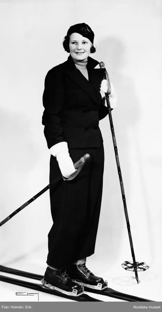Modell klädd i skidkläder. Dubbelknäppt jacka, polotröja, byxor, pjäxor, mössa och vita vantar. Står på ett par skidor och håller stavar i händerna.