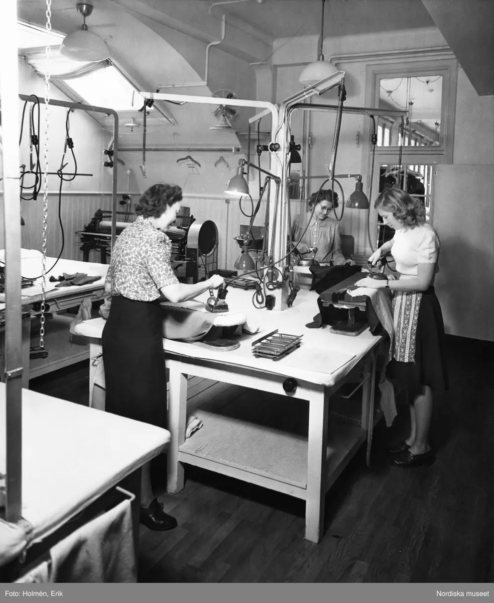 Interiör från E-sektionen på Nordiska Kompaniet. Tre kvinnor står och stryker vid arbetsbord.