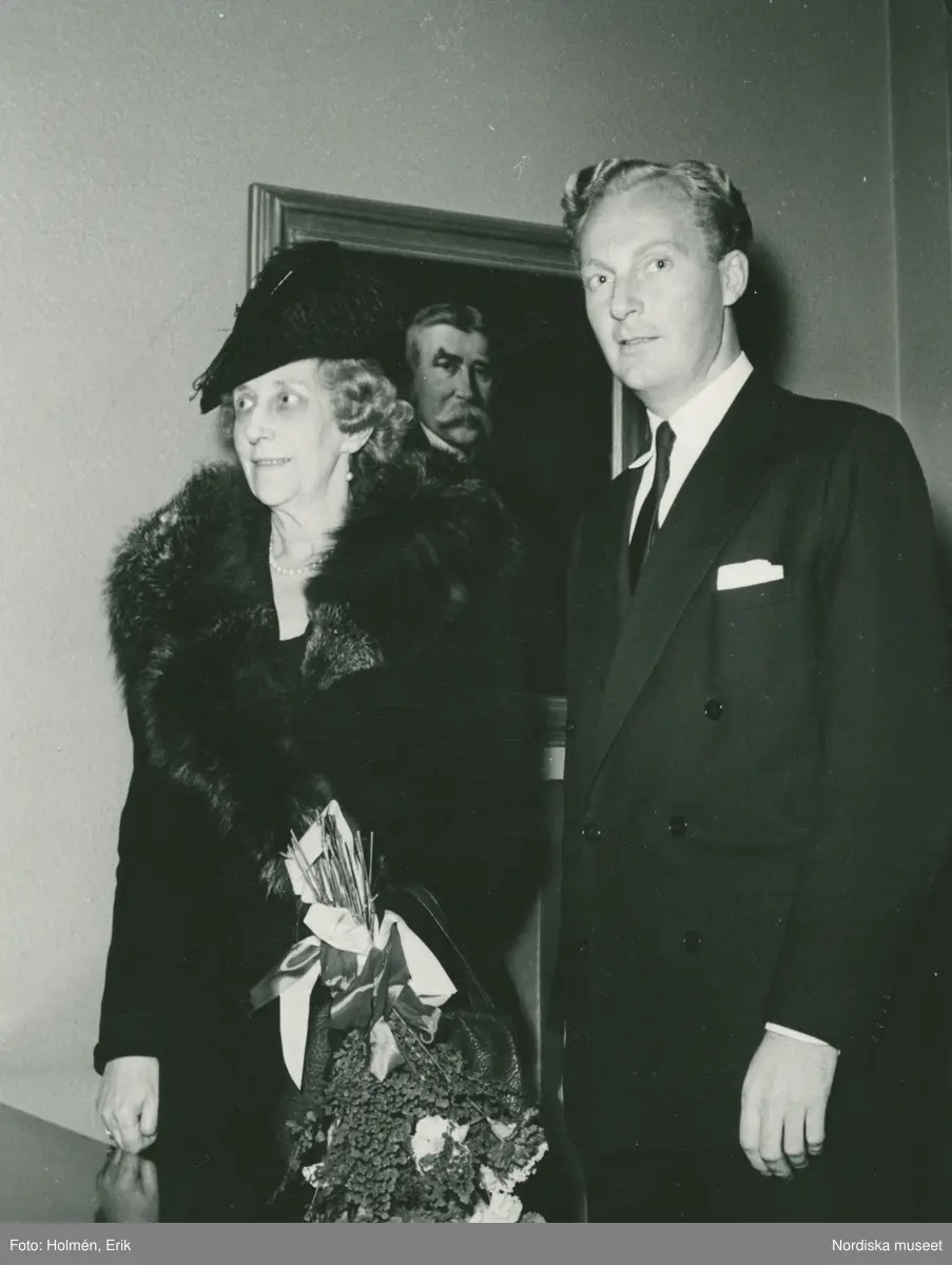"Prinsessan Ingeborg hälsar på sin kände landsman M:r Erik vid ett besök på NK på tisdagen och, vid en särskild visning, besåg hela hans kollektion hattar."