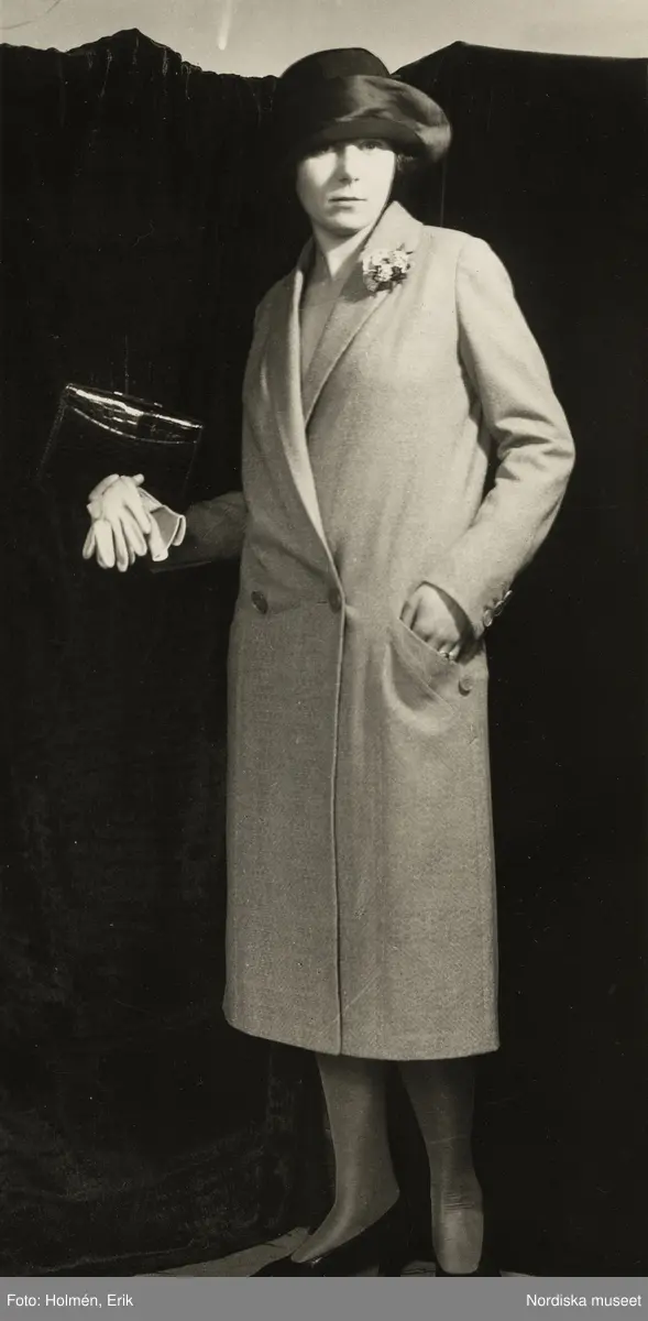 Modell klädd i dubbelknäppt kappa, pumps och hatt. Håller i vita handskar och svart handväska. Brosch på kappan.