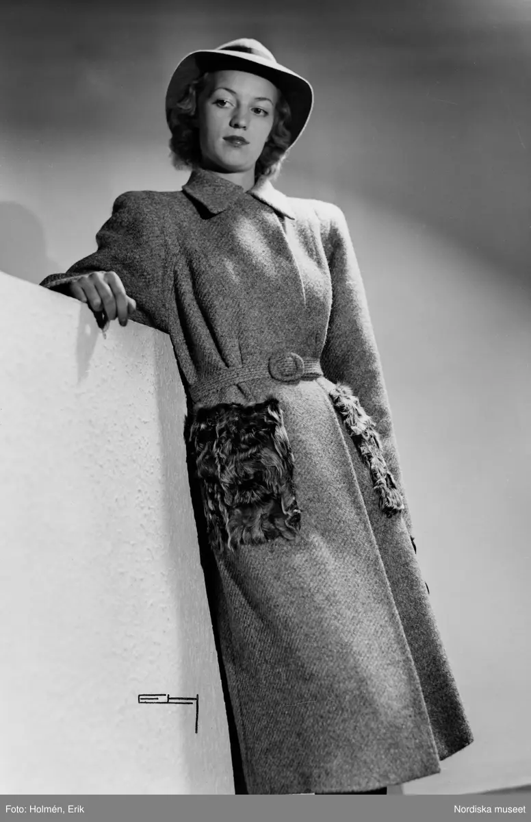 Modell klädd i tweedkappa och hatt. Vit bakgrund.