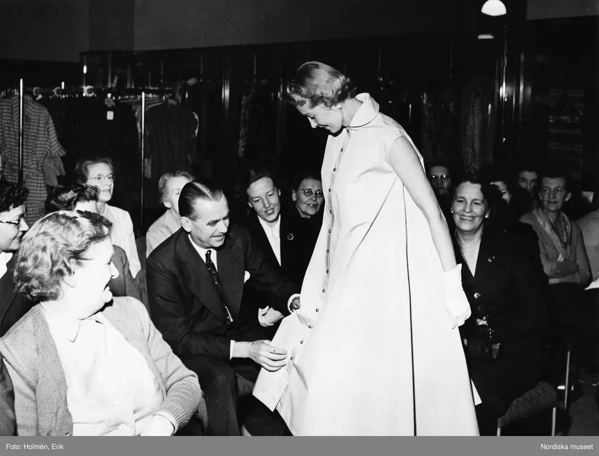 Konfektionsvisning för personalen på Nordiska Kompaniet. Modell, fru Irja Nilsson, klädd i tältklänning av bomullspoplin, samt vita handskar och örhängen. Pris: 98SEK. Man i publiken känner på klänningens material.