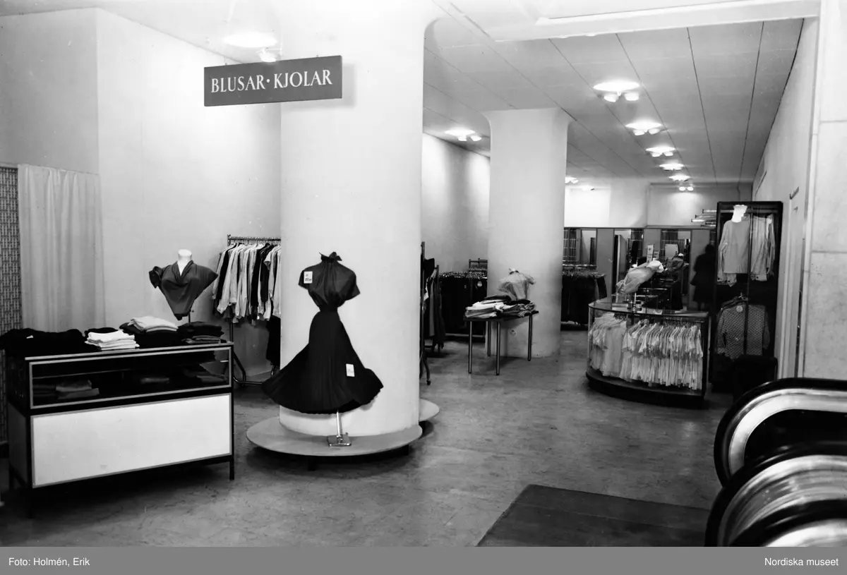 Interiör från Nordiska Kompaniet. I mitten syns en provdocka klädd i knytblus och plisserad kjol. Över dockan hänger en skylt med texten "Blusar och Kjolar."