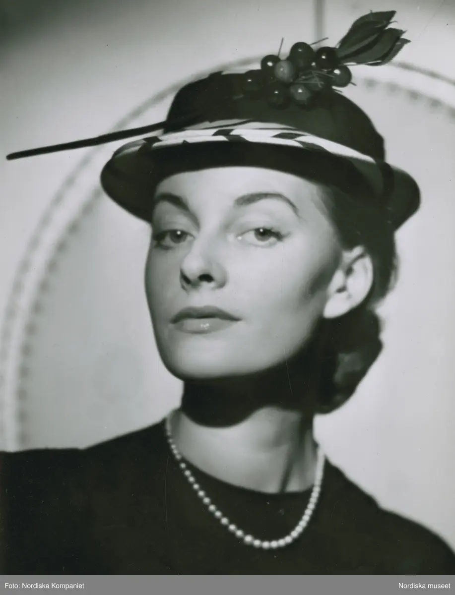 Porträtt av modell i hatt med garnityr, av Simone Cange, samt pärlhalsband.