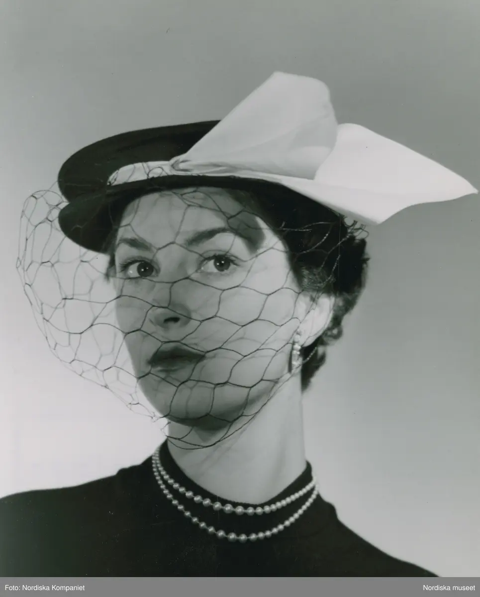 Porträtt av modell i blå hatt med vit stärkt rosett, flor och pärlhalsband. Av Rose Valois.