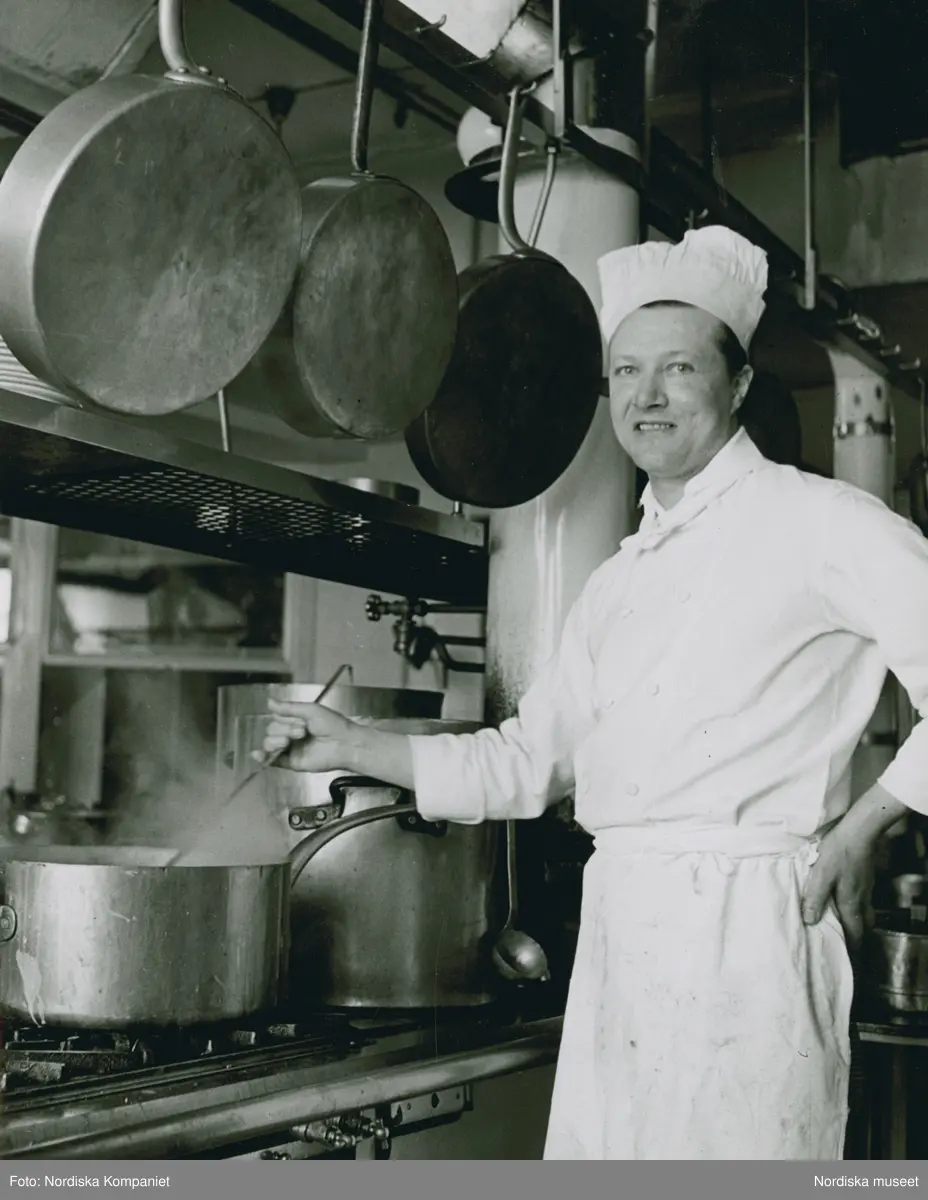 Man i kockkläder och mössa rör i en gryta. påskrift med blyerts på baksidan: "NK - kök 1947"