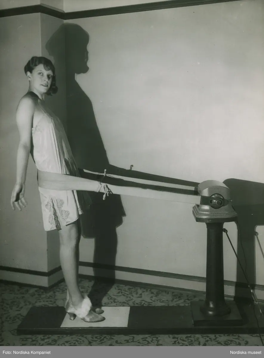 Demonstration av massageapparat. Kvinna i underklänning med massagebandet över stussen. Nordiska Kompaniet. Text med blyerts på baksidan: "Savage-motorn Feb. 1930 Kroppskultur massageapparat."