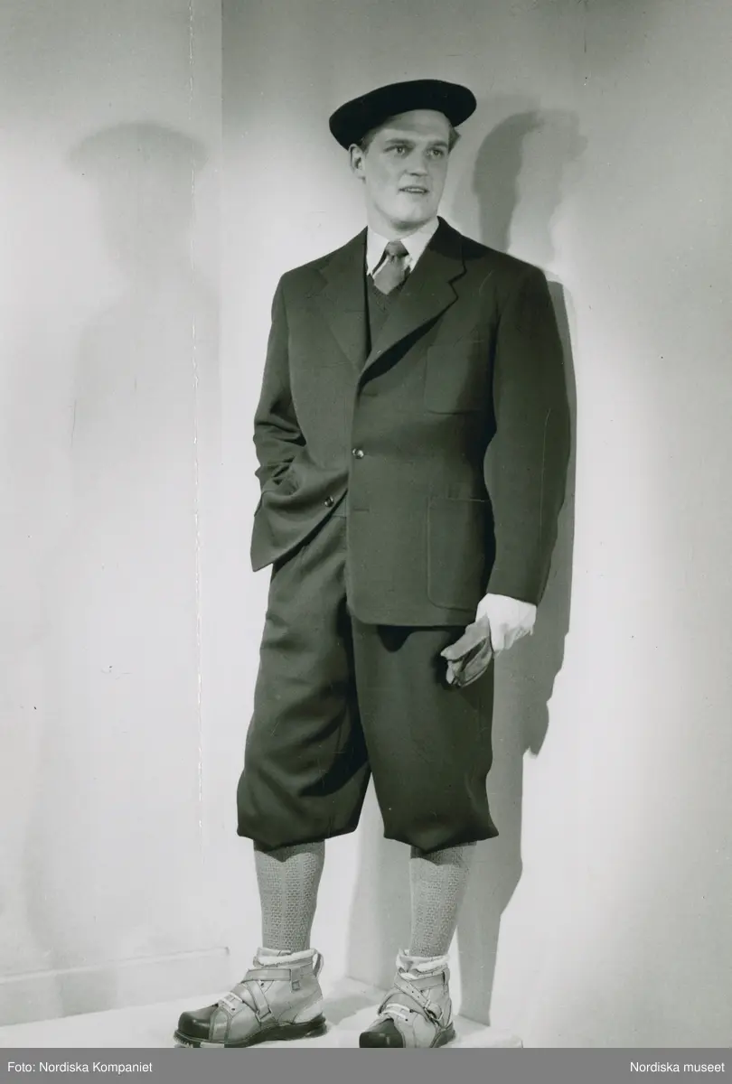 Man i mörk keps, mörk kavaj och knäbyxor. Vit skjorta, slips. Stickade knästrumpor och på fötterna skidskor/pjäxor. Nordiska Kompaniet. Text med blyerts på baksidan: "Skidtruppen S:t Moritz febr 1948"