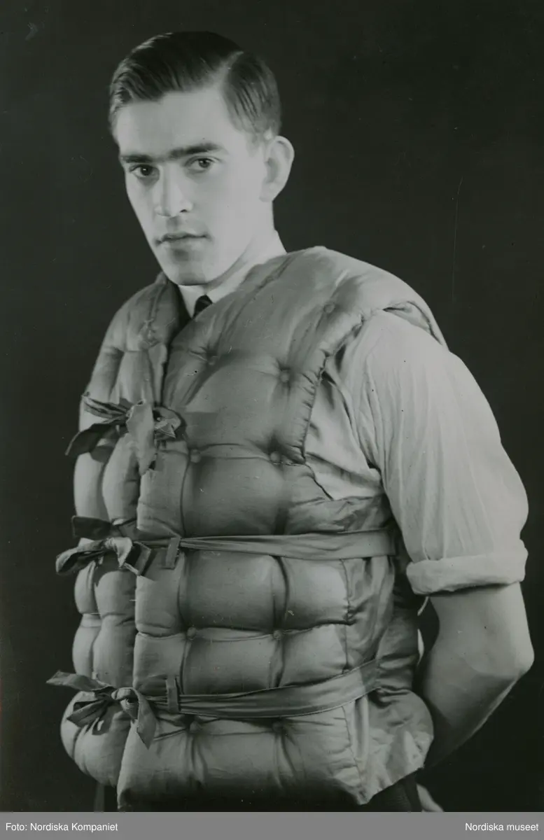 Ung man i vit skjorta med uppkavlade ärmar, slips och flytväst. Nordiska Kompaniet. Text med blyerts på baksidan: "DF Flytväst (herr Lindblad)"