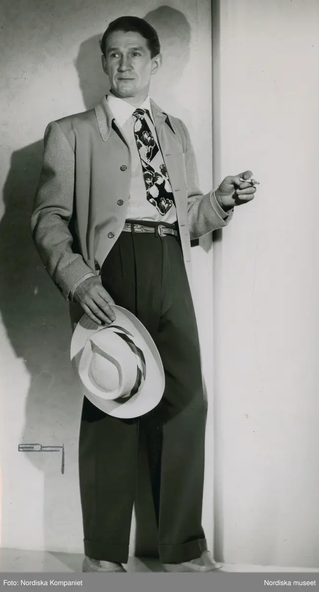 Man med vit skjorta och stormönstrad slips. Ljus jacka och mörka byxor. I ena handen en stråhatt, i den andra en cigarett. Text med blyerts på baksidan: "Utställning California 1947"