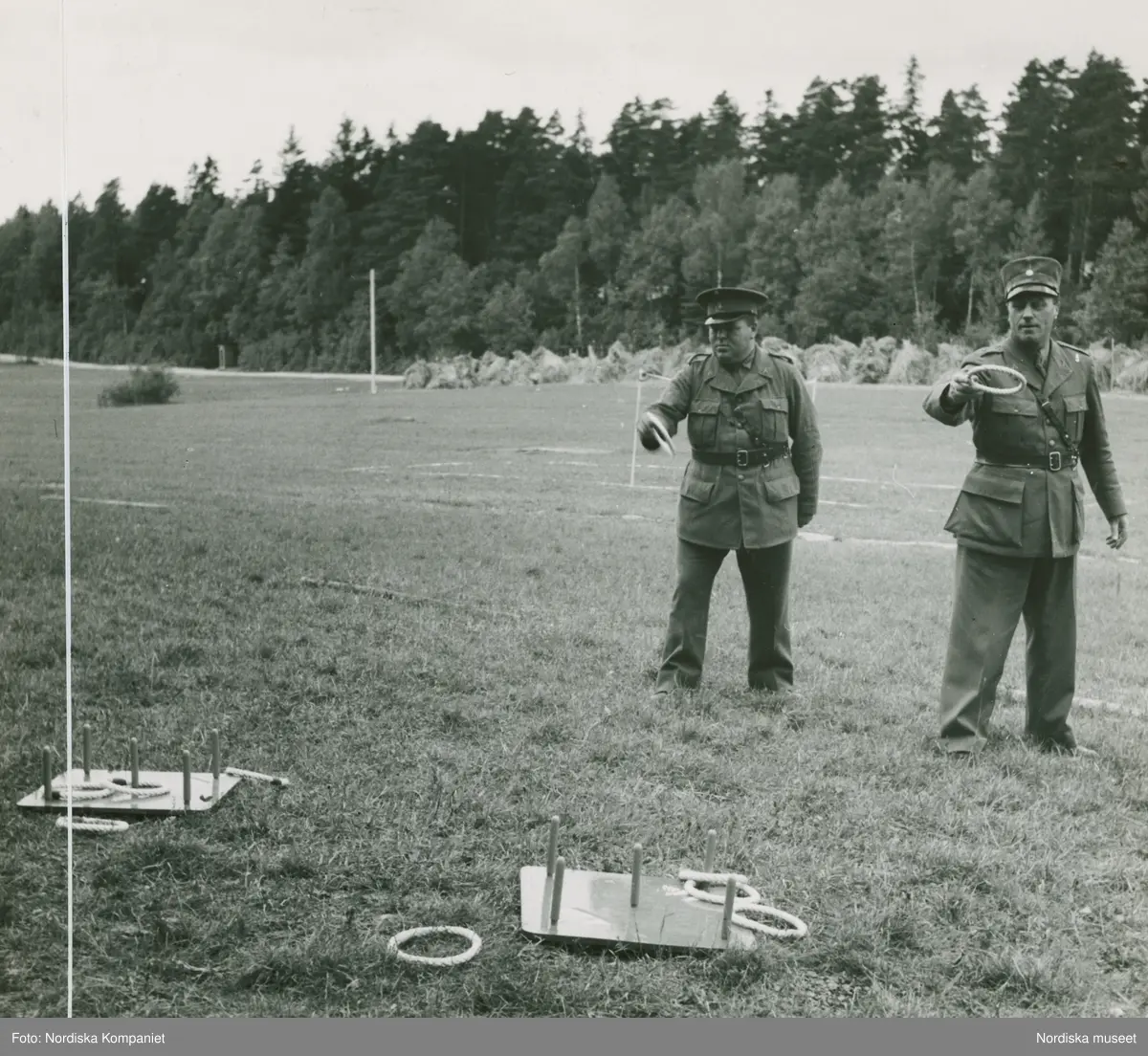Två uniformerade män på ett fält kastar ringar mot en träplatta med fyra pinnar. Nordiska Kompaniet. Text med blyerts på baksidan: "Sjömansspelet Katalog Nöjen i fält"
