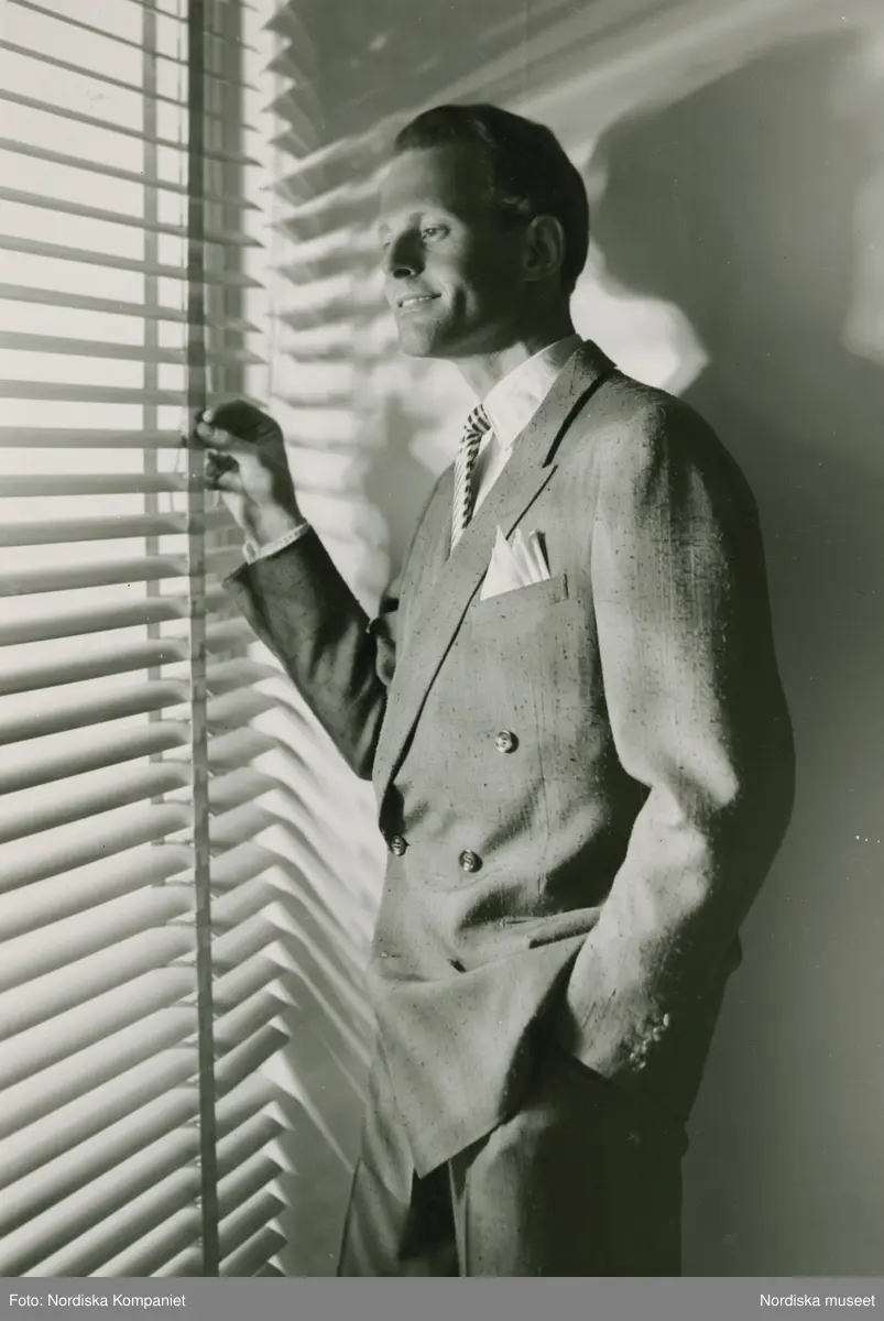 En man i vit skjorta, randig slips och ljus kostym i shantung kikar ut genom persienn. Nordiska Kompaniet. På baksidan maskinskriven påklistrad lapp: "Male mannequins showing our new line in real Shantung Pesante" "1956"