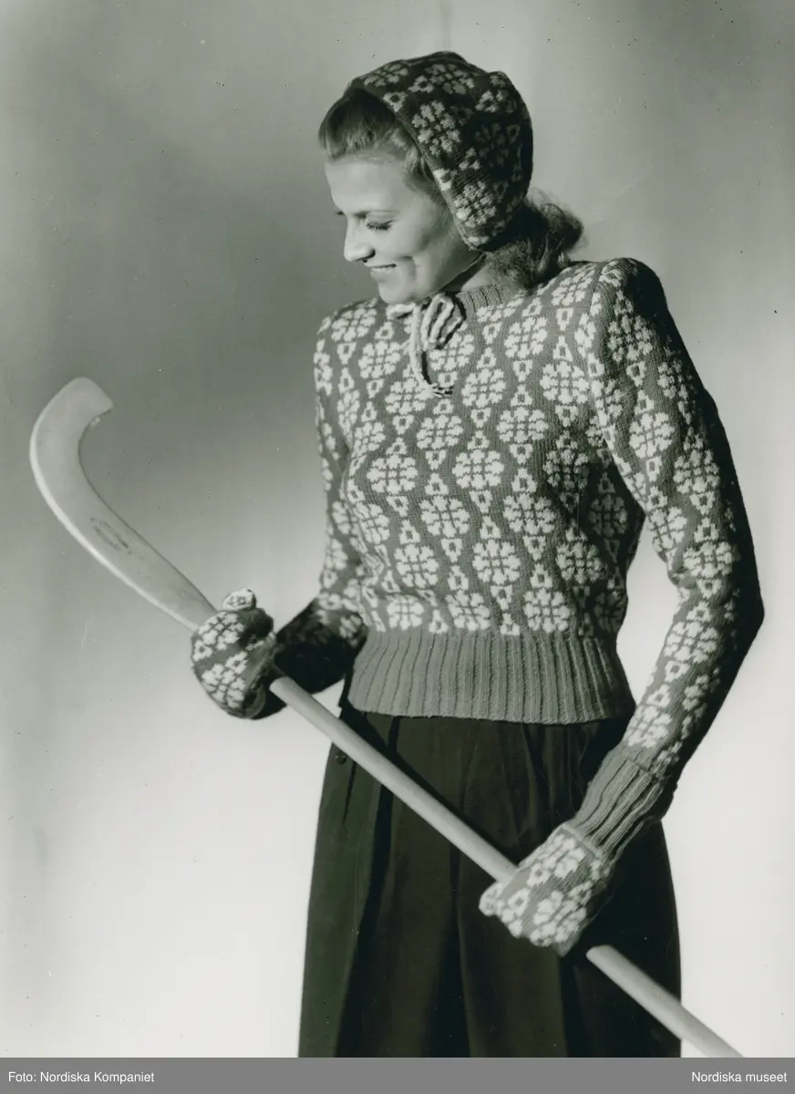 Kvinna med mössa, tröja och vantar i samma mönster. Mörka långbyxor. I handen håller hon en bandyklubba. Nordiska Kompaniet.