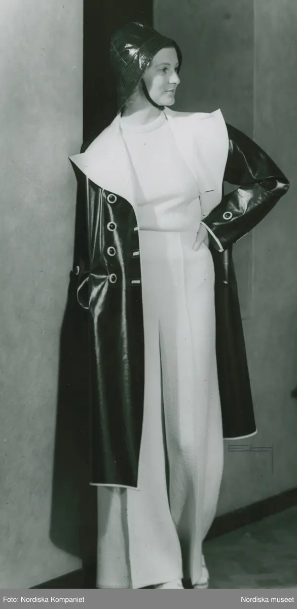 Kvinna i vit tröja, vita vida långbyxor, mörk sydväst och mörk regnkappa med vita detaljer. Nordiska Kompaniet. Text med blyerts på baksidan: "EA Maj 1938 Sportkläder"