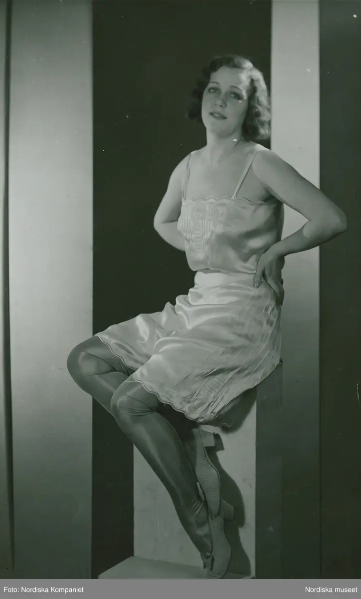 Kvinna i underkläder. Nordiska Kompaniet. Text med blyerts på baksidan: "Garnityr , byxor och linnen, i crepe satin lavable, handbroderat. Elegant wienerarbete."