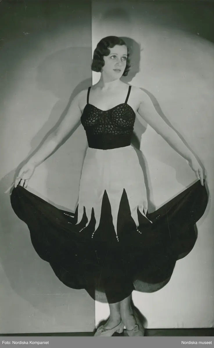 Kvinna i underkläder. Text med blyerts på baksidan: "Underkjol av rosa och svart crepe de chine. Parismodell."