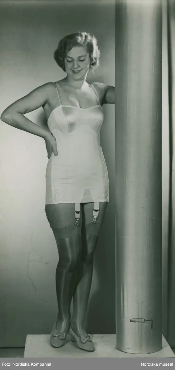 kvinna i korsett, strumpor och högklackade skor med rosett. Nordiska Kompaniet. Text med blyerts på baksidan: "Korsetter"