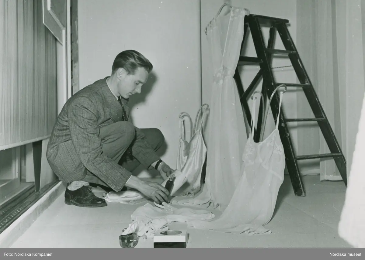En man sitter på huk och arrangerar parfymflaskor bland skyltade underkläder. Text med blyerts på baksidan: "Div. bilder. Kända stockholmare skylta jan. 1946."