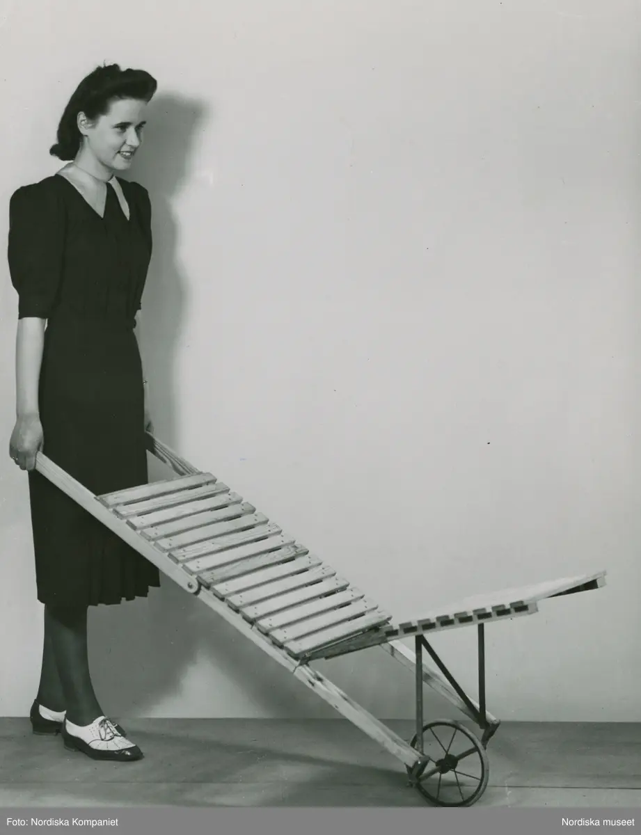 En kvinna i mörk klänning med ljus krage skjuter en pirra frramför sig. Text med blyerts på baksidan: "K.E. diverse".