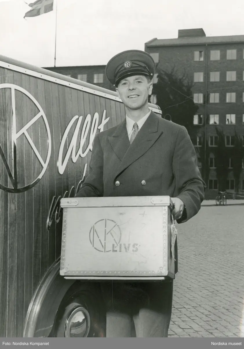 En leende, uniformsklädd man med Nordiska Kompaniets varumärke i skärmmössan håller i en trälåda med texten "NK-LIVS". Bredvid honom en NK-märkt bil. Text med blyerts på baksidan: "Nya uniformer NK:s varubilar."