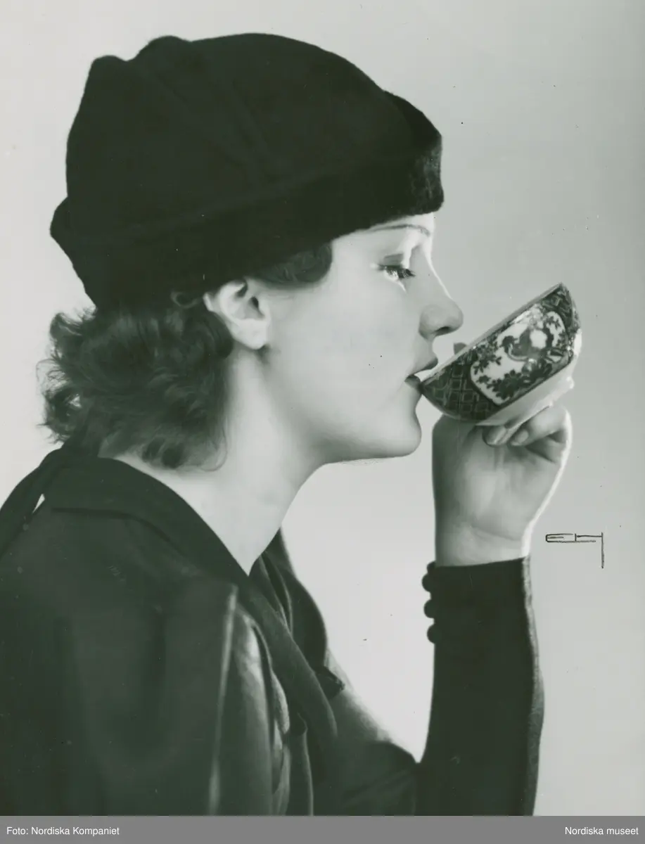Kvinna i svart mössa lyfter en tekopp mot munnen. Text med blyerts på baksidan: "Måltider, personer drickande kaffe, tee etc."