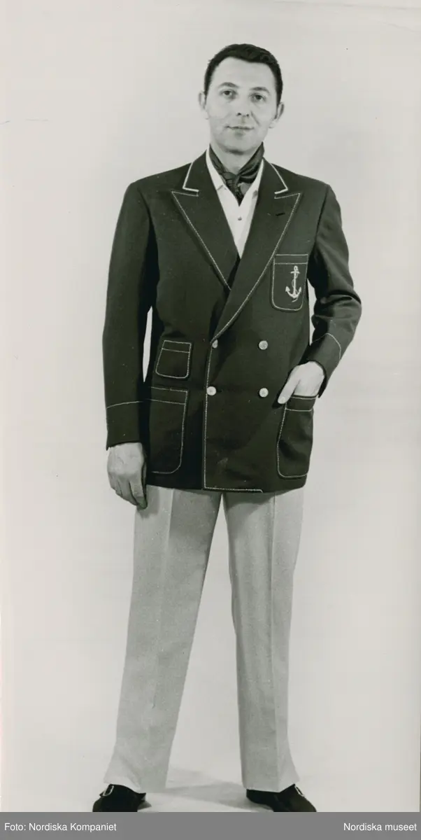 Man iklädd mörk kavaj med markerade vita sömmar. På bröstfickan ett ankare. Vit skjorta, scarf knuten i halsen, ljusa byxor och mörka skor.