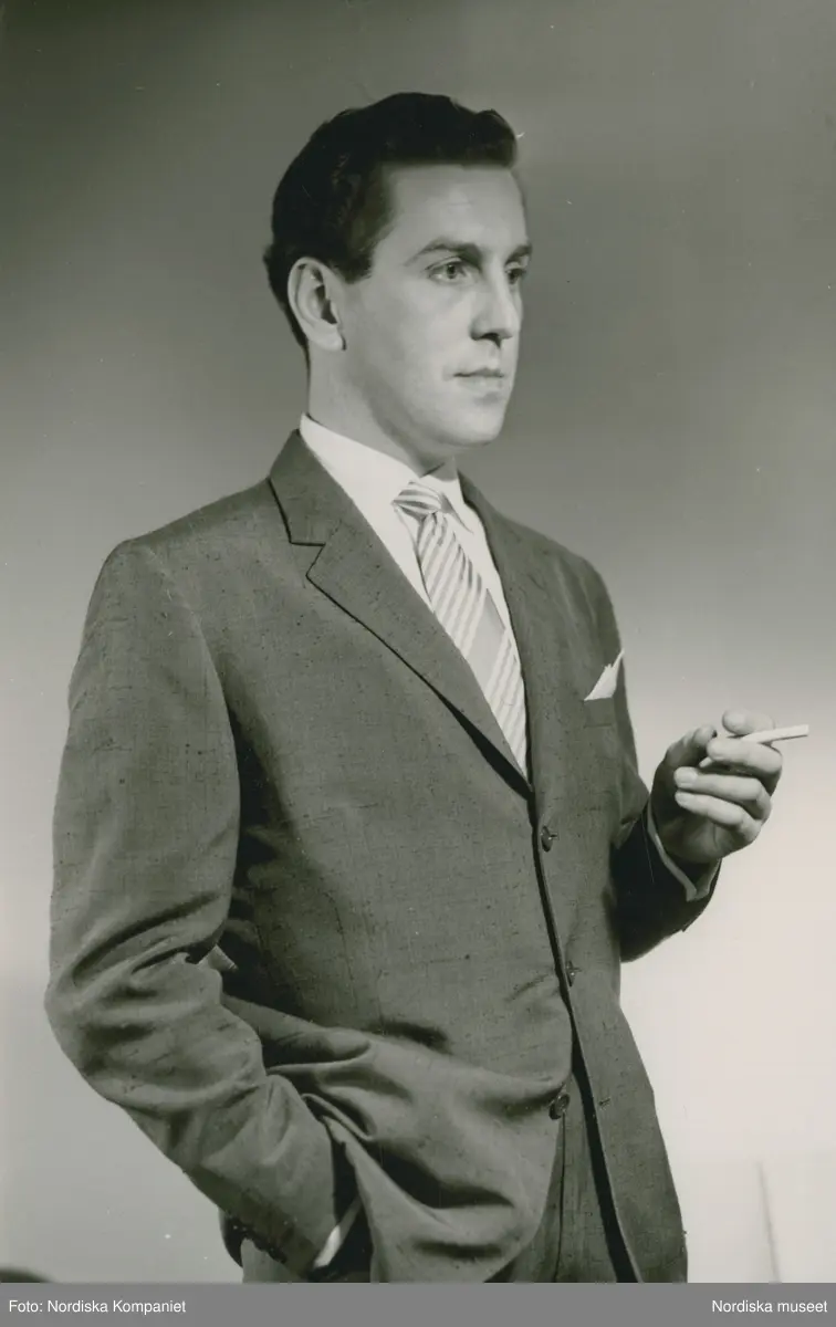 Man iklädd vit skjorta, diagonalrandig slips samt kostym i shantung. I ena handen håller han en cigarett. Nordiska Kompaniet. text med blyerts på baksidan: "GC Dec 1955"