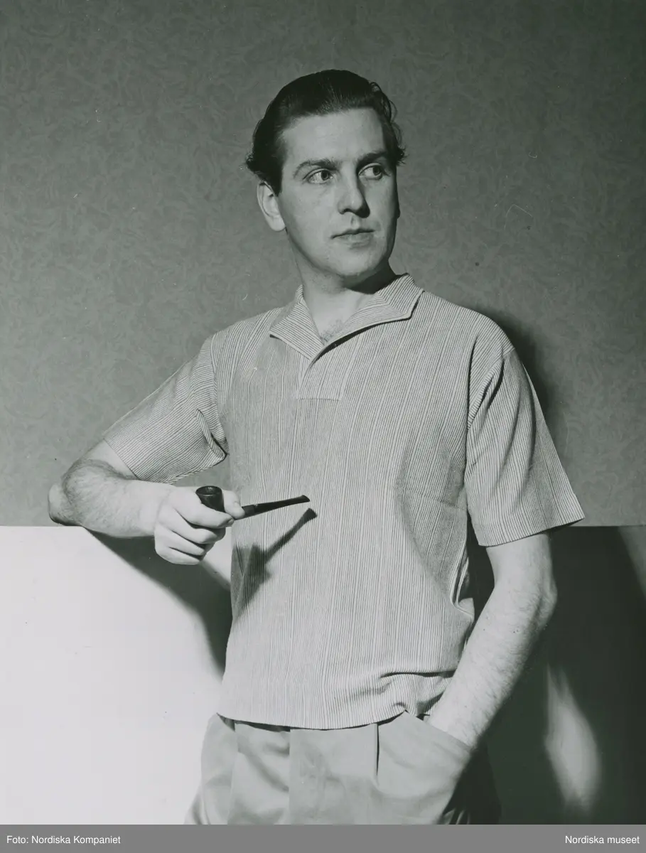 Man i smalrandig, kortärmad skjorta utan knäppning. Ljusa byxor. I ena handen håller han en pipa. Text med blyerts på baksidan: "Ital. herrmodet Italiana 1953"