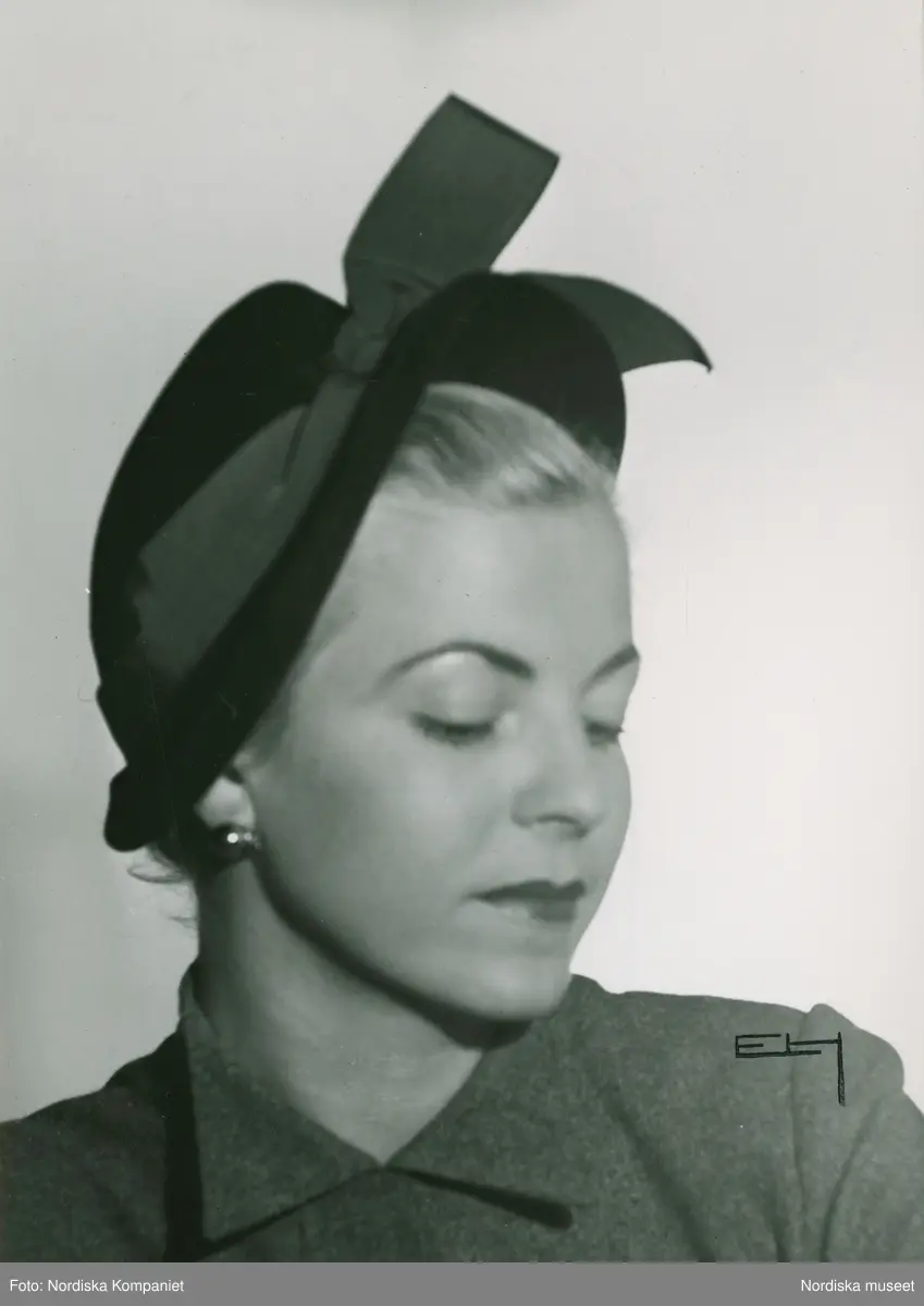 Porträtt av modell i buteljgrön velourhatt med brun bandgarnering, samt örhänge. Av Claude S:t Cyr, Paris.