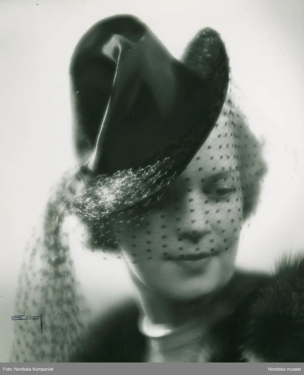 Modell i hatt med hög kulle och smalt, svängt brätte, flor.